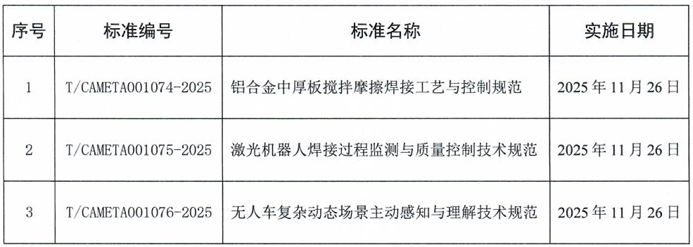 中國機電一體化技術應用協會批準《鋁合金中厚板攪拌摩擦焊接工藝與控制規范》《激光機器人焊接過程監測與質量控制技術規范》《無人車復雜動態場景主動感知與理解技術規范》3項團體標準,現予以公布。